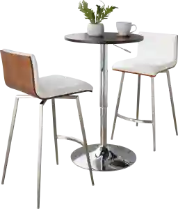 Create a cozy pub or bistro atmosphere in your home with the mid-century modern design of the Mason Swivel Adjustable Counter Height Dining Set. This sleek table has a chrome metal base with a round wood top that adds a rich contrast. The adjustable bar table can be adjusted from dining to bar height. The stools add casual comfort with a padded upholstered seat and backrest. Available in a variety of upholstery colors, choose the one that ties in with your decor. Customer assembly is required.