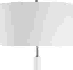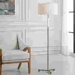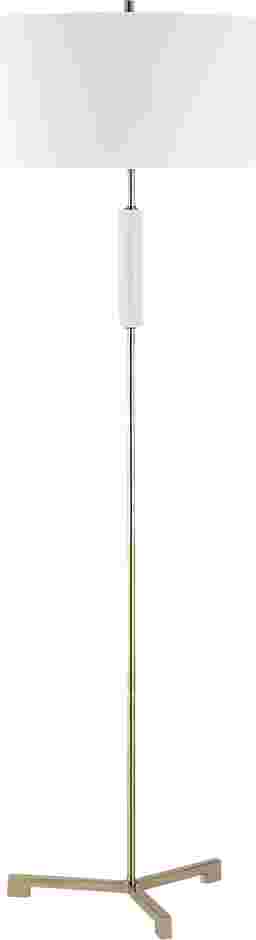The Nashua Cay Brass Floor Lam is simple in design. The metal body is finished in an antique brass and is adorned with a piece of white marble, adding a touch of elegance. The shade is a round hardback in off-white linen. Partial assembly may be required.