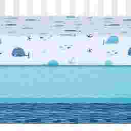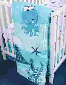 Your little mate will make waves with the Nautical Adventure Blue 4 Pc Baby Bedding Set. An octopus wearing a sailor hat swims through the waves with whales, fish, and starfish. The soft color palette of navy, light blue, aqua, and white creates the perfect nautical nursery collection. The skirt features a wave print in aqua and navy blue with a light blue stripe at the bottom. The fitted crib sheet features a directional nautical print with whales, octopuses, fish, waves, and anchors. This 4-piece set includes a quilt, skirt, fitted crib sheet, and a plush smiling octopus toy. The quilt measures 35 inches x 45 inches. The skirt fits a standard crib mattress, 28 inches x 52 inches, with a 14-inch drop. The fitted crib sheet fits a standard crib mattress, 28 inches x 52 inches, with 8-inch deep pockets, and is fully elasticized for a secure fit. The smiling octopus toy measures 9 inches tall and is made of soft plush fabric in light blue. Quilt 100% polyester. Filling 100% polyester. Fitted Crib Sheet 100% polyester. Crib Skirt 100% polyester, Platform 100% olefin. Plush Toy 100% polyester. Machine wash cold with like colors, gentle cycle. Do not bleach. Tumble dry low or line dry. Do not iron. Do not dry clean.