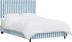 Just because a bed goes with everything doesn't mean it lacks in style. This simple piece stands out because the headboard and bed rails are upholstered in a quality Stripe fabric that holds its own as a design feature. The custom made Nautical Blues bed has a square shape with an inset border detail and it is manufactured in Illinois. Invest in a bed that is well made and a style that will last you through several remodels. Customer assembly is required. Foundation required. Mattress and foundation sold separately. This piece is made to order and may take up to 6 weeks to deliver.