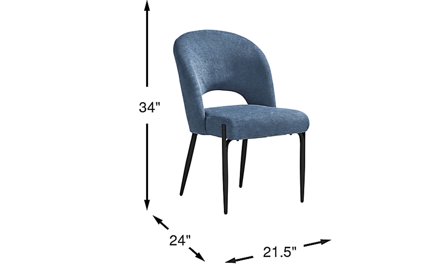 Set a place for style and comfort when the Navarro dining chair makes its appearance at your next get-together. This upholstered seat in blue features rounded edges and a chic knock-out detail in the back. Poised metal legs in black enhance the look with contemporary appeal.