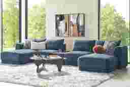 The story of your space is waiting to unfold, its memories, laughs, movie nights and great times, all with the Drew & Jonathan ModularFour living room as the setting you configure to bring it to life. This customizable contemporary seating solution features individual pieces that can be reconfigured endlessly to the shape you need. All-sides upholstery in navy blue chenille offers modern style and comfort at every angle while large, rounded wedge arms invite long sessions of indulgent relaxation. Effortlessly tailor your seating arrangement for everything from game days to sleepovers to everyday relaxation with easy-to-use connectors for rock solid stability. The included media console features integrated bluetooth-enabled speakers, USB-A and USB-C charging, and can connect with up to 5 additional media consoles for an incredible surround-sound experience. Includes left arm chaise, media console, two armless chairs and right arm chaise. Visit a showroom to learn more about individual components and to work with a sales specialist to customize your own configuration today. Upholstery: 100% Polyester.