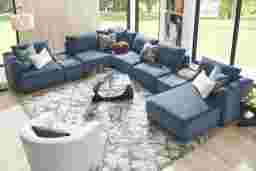 The story of your space is waiting to unfold, its memories, laughs, movie nights and great times, all with the Drew & Jonathan ModularFour living room as the setting you configure to bring it to life. This customizable contemporary seating solution features individual pieces that can be reconfigured endlessly to the shape you need. All-sides upholstery in navy blue chenille offers modern style and comfort at every angle while large, rounded wedge arms invite long sessions of indulgent relaxation. Effortlessly tailor your seating arrangement for everything from game days to sleepovers to everyday relaxation with easy-to-use connectors for rock solid stability. The included media consoles feature integrated bluetooth-enabled speakers, USB-A and USB-C charging, and can connect with up to 5 additional media consoles for an incredible surround-sound experience. Includes left arm chair, two media consoles, three armless chairs, wedge and right arm chaise. Visit a showroom to learn more about individual components and to work with a sales specialist to customize your own configuration today. Upholstery: 100% Polyester.
