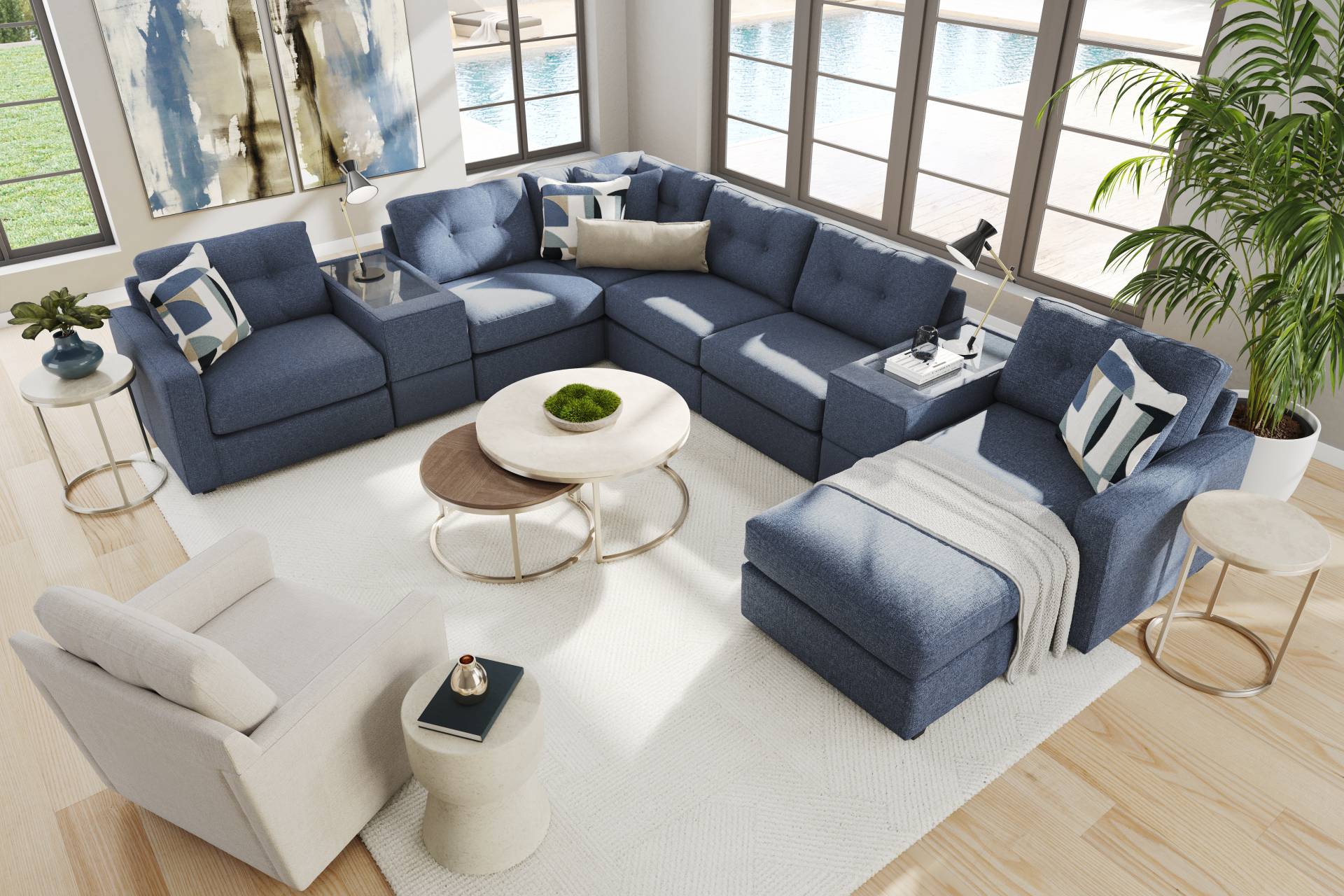 Discover the limitless possibilities of the Drew & Jonathan ModularOne, thoughtfully designed with comfort and flexibility in mind. This customizable seating solution features individual pieces that can be reconfigured to the shape you need. Game days, movie nights, sleepovers, and everyday relaxation are all better when the seating arrangement you want is always right at your fingertips. Each individual piece is upholstered on all sides in our signature fabric, Miller. This textured navy fabric includes Repreve yarn, made with recycled plastic bottles. The open seating includes a chaise and has welted track arms, top-stitched seat cushions and button-tufted back cushions for an elegant silhouette. Two center consoles provide hidden storage and double as side tables with an acrylic top. A matching pillow provides the perfect final touch. Includes RAF chaise, two consoles, three armless chairs, corner wedge, and LAF chair. Visit a showroom to learn more about individual components and to work with a sales specialist to customize your own configuration today. Upholstery: 100% Polypropylene