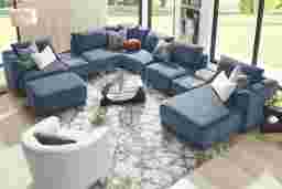 The story of your space is waiting to unfold, its memories, laughs, movie nights and great times, all with the Drew & Jonathan ModularFour living room as the setting you configure to bring it to life. This customizable contemporary seating solution features individual pieces that can be reconfigured endlessly to the shape you need. All-sides upholstery in navy blue chenille offers modern style and comfort at every angle while large, rounded wedge arms invite long sessions of indulgent relaxation. Effortlessly tailor your seating arrangement for everything from game days to sleepovers to everyday relaxation with easy-to-use connectors for rock solid stability. The included media consoles feature integrated bluetooth-enabled speakers, USB-A and USB-C charging, and can connect with up to 5 additional media consoles for an incredible surround-sound experience. Includes left arm chair, two media consoles, three armless chairs, wedge, ottoman and right arm chaise. Visit a showroom to learn more about individual components and to work with a sales specialist to customize your own configuration today. Upholstery: 100% Polyester.
