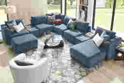 The story of your space is waiting to unfold, its memories, laughs, movie nights and great times, all with the Drew & Jonathan ModularFour living room as the setting you configure to bring it to life. This customizable contemporary seating solution features individual pieces that can be reconfigured endlessly to the shape you need. All-sides upholstery in navy blue chenille offers modern style and comfort at every angle while large, rounded wedge arms invite long sessions of indulgent relaxation. Effortlessly tailor your seating arrangement for everything from game days to sleepovers to everyday relaxation with easy-to-use connectors for rock solid stability. The included consoles feature integrated USB-A and USB-C charging for ultimate convenience. Includes left arm chair, two consoles, three armless chairs, wedge, ottoman and right arm chaise. Visit a showroom to learn more about individual components and to work with a sales specialist to customize your own configuration today. Upholstery: 100% Polyester.