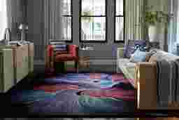 How do I coordinate the bold colors of this abstract rug with my existing furniture?