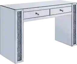 The Nedderson desk will give any room a touch of glamour. This contemporary desk is fully mirrored with a stunning mirror top and a faux diamond inlay on each leg of its sled base. Use this unique vanity desk for make-up application, jewelry, or as a small writing desk. Two large drawers provide ample and convenient storage for makeup brushes, jewelry, and more. Customer assembly is required.