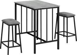 Elevate your dining experience with this trendy Neia Gray 3 Pc Counter Height Dining Set Made for casual family dining, this contemporary and fashionable style bistro set has a two-tone finish with a wood-look gray laminate 36 rectangular table top and black metal legs. The gray fabric cushioned seats provide ultimate comfort while the sturdy construction ensures durability for years to come. Perfect for small spaces, this 3-piece set is easy to assemble with full illustrated instructions included. Daily maintenance is convenient with an easy to clean top, making it a practical solution for any kitchen or dining space. Backed by a 2 year limited warranty for your peace of mind, this 3pcs set is a must-have. Customer assembly required.