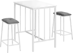 Elevate your dining experience with this trendy Neia White 3 Pc Counter Height Dining Set Made for casual family dining, this contemporary and fashionable style bistro set has a white laminate 36 rectangular table top and white metal legs. The gray fabric cushioned seats provide ultimate comfort while the sturdy construction ensures durability for years to come. Perfect for small spaces, this 3-piece set is easy to assemble with full illustrated instructions included. Daily maintenance is convenient with an easy to clean top, making it a practical solution for any kitchen or dining space. Backed by a 2 year limited warranty for your peace of mind, this 3pcs set is a must-have if you are looking for a space saving design to upgrade your home. Customer assembly required.