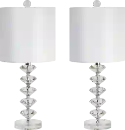 The genuine crystal Neloula Road lamp set of 2 showcases a gorgeous stack of five diamond styled crystals separated by beautiful polished chrome spacers. Topped by hardback drum shades wrapped in off-white silk-inspired fabric, this table lamp set has the perfect blend of modern glamour and timeless sophistication. Partial assembly may be required.