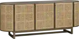 Enhance your living space with the Nemoair brown sideboard, a blend of rustic charm and modern elegance. Crafted from mindi wood in a warm brown natural wood grain finish, it features 5 woven cane doors, each with European hinges and antique brass round knobs. Inside, 4 fixed shelves offer ample storage, while rounded edges add a soft touch. Cord management ensures a tidy setup. With adjustable levelers, this piece is both beautiful and functional. Customer assembly is required.