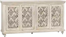 The Nemomaster natural sideboard, made from durable mango wood, features a charming whitewash finish that enhances its intricate hand-carved floral lattice doors. Behind the four doors, you'll find two removable interior shelves, offering flexible storage solutions. Thoughtfully designed with cord management holes and sturdy floor levelers, it's as practical as it is stylish. Matte black drop ring handles add a bold accent, making this sideboard a functional yet eye-catching piece for your space.