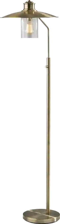 Brighten your space with the metallic warmth and elegant styling of the Nephi Creek floor lamp. Its antique brass finish and clear seeded glass shade complement both pared-down styling and ornately detailed looks. Constructed of monochrome antique brass, the lamp features a 10 diameter round base supporting a narrow tube. Topping the light's shade is a classically embellished antique brass dome above a cylindrical glass piece made of seeded clear glass. The glass shade leaves the included 40W vintage Edison bulb visible for a striking look. Partial assembly may be required.