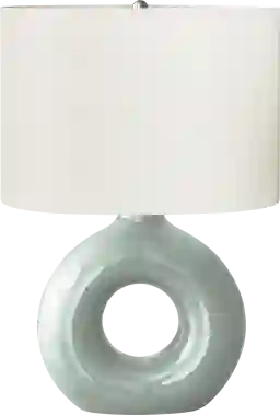 Add some modern ambiance to your home with the stylish and trendy Neveux Shade Green Lamp in green ceramic with a chic ivory shade. This decorative table lamp will brighten up any room with its contemporary, donut-shaped ceramic base and oval linen-blend fabric shade. A perfect size to place on an end or side table, or as a bedside lamp on your nightstand, this lamp will illuminate your space with a soft and inviting glow. Partial assembly may be required.