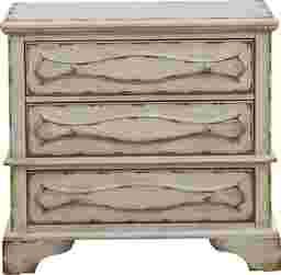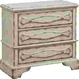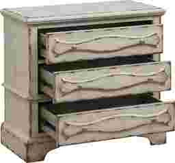 This sweet little accent cabinet is finished in an antiqued rubbed though aged white that has an unmistakable vintage aura. The three drawer fronts feature gently curved and raised designs, as well as wooden knobs in the same finish. Ideal for your kitchen, powder room, or anywhere extra storage is needed.