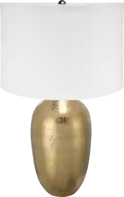 Reinventing the traditional urn silhouette, the elegant Newham Club lamp features a round shape, a white fabric drum shade, a muted gold hue, and intricate artistic detailing across the surface. Partial assembly may be required.