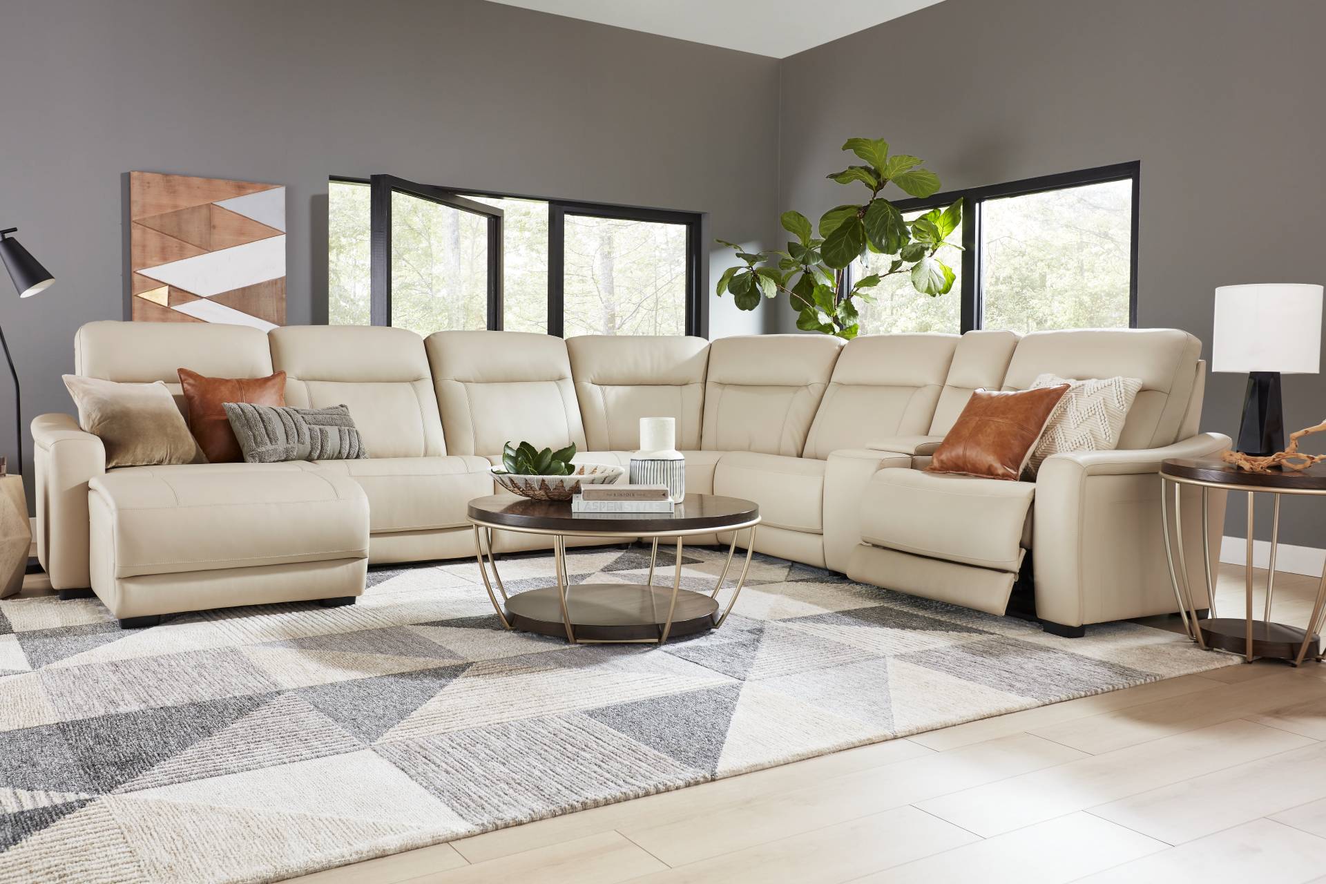 The sleek design, understated sophistication and casual profile of the Drew & Jonathan Newport sectional presents a warm, inviting feeling the whole family can enjoy. Modern in style, this sectional is upholstered in a soft, supple top grain leather where the body touches with stylish double top-stitched seams for a luxurious look. Curved, padded arms, wide seats and an elongated footrest in the chaise provide ample space for exceptional comfort. The console adds more space as its hidden cupholders and storage compartment hold your relaxation essentials perfectly. Dual power reclining functions provide the finishing touch, allowing adjustments in the head and footrest with a patented zero gravity mechanism for the ultimate lounging experience. Upholstery: Top grain leather where the body touches. Polyurethane sides and back.