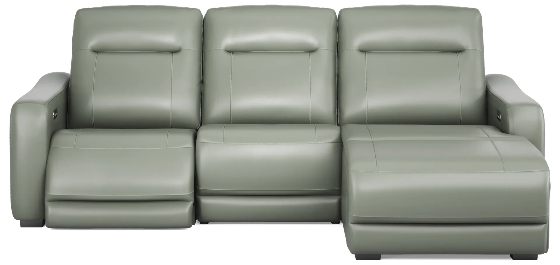 The sleek design, understated sophistication and casual profile of the Drew & Jonathan Newport sectional presents a warm, inviting feeling the whole family can enjoy. Modern in style, this sectional is upholstered in a soft, supple mint-colored top grain leather where the body touches with stylish double top-stitched seams for a luxurious look. Curved, padded arms, wide seats and an elongated footrest in the chaise provide ample space for exceptional comfort. Dual power reclining functions provide the finishing touch, allowing adjustments in the head and footrest with a patented zero gravity mechanism for the ultimate lounging experience, as well as convenient charging ports in the control panel. Upholstery: Top grain leather where the body touches. Polyurethane sides and back.