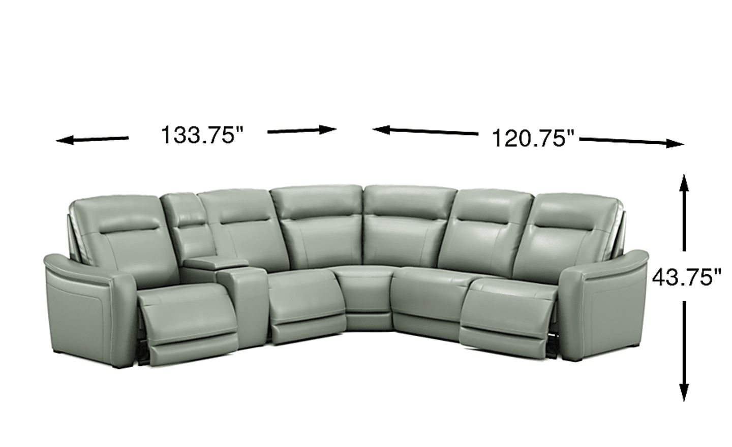 The sleek design, understated sophistication and casual profile of the Drew & Jonathan Newport sectional presents a warm, inviting feeling the whole family can enjoy. Modern in style, this sectional is upholstered in a soft, supple mint-colored top grain leather where the body touches with stylish double top-stitched seams for a luxurious look. Curved, padded arms, wide seats and an elongated footrest in the chaise provide ample space for exceptional comfort. The console adds more space as its hidden cupholders and storage compartment hold your relaxation essentials perfectly, as well as additional charging ports for devices. Dual power reclining functions provide the finishing touch, allowing adjustments in the head and footrest with a patented zero gravity mechanism for the ultimate lounging experience. Upholstery: Top grain leather where the body touches. Vinyl sides and back.