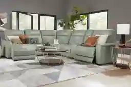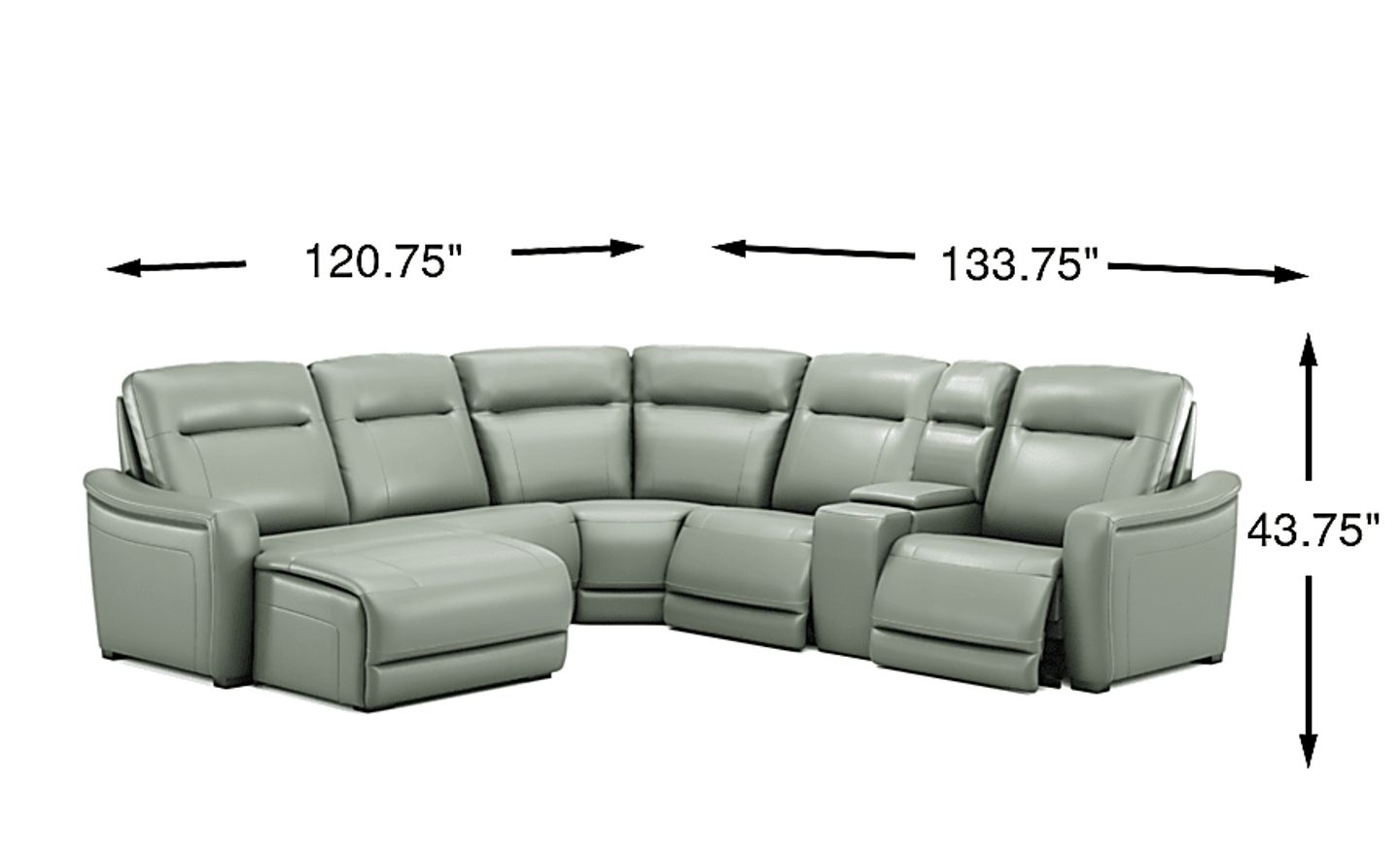 The sleek design, understated sophistication and casual profile of the Drew & Jonathan Newport sectional presents a warm, inviting feeling the whole family can enjoy. Modern in style, this sectional is upholstered in a soft, supple mint-colored top grain leather where the body touches with stylish double top-stitched seams for a luxurious look. Curved, padded arms, wide seats and an elongated footrest in the chaise provide ample space for exceptional comfort. The console adds more space as its hidden cupholders and storage compartment hold your relaxation essentials perfectly, as well as additional charging ports for devices. Dual power reclining functions provide the finishing touch, allowing adjustments in the head and footrest with a patented zero gravity mechanism for the ultimate lounging experience. Upholstery: Top grain leather where the body touches. Vinyl sides and back.