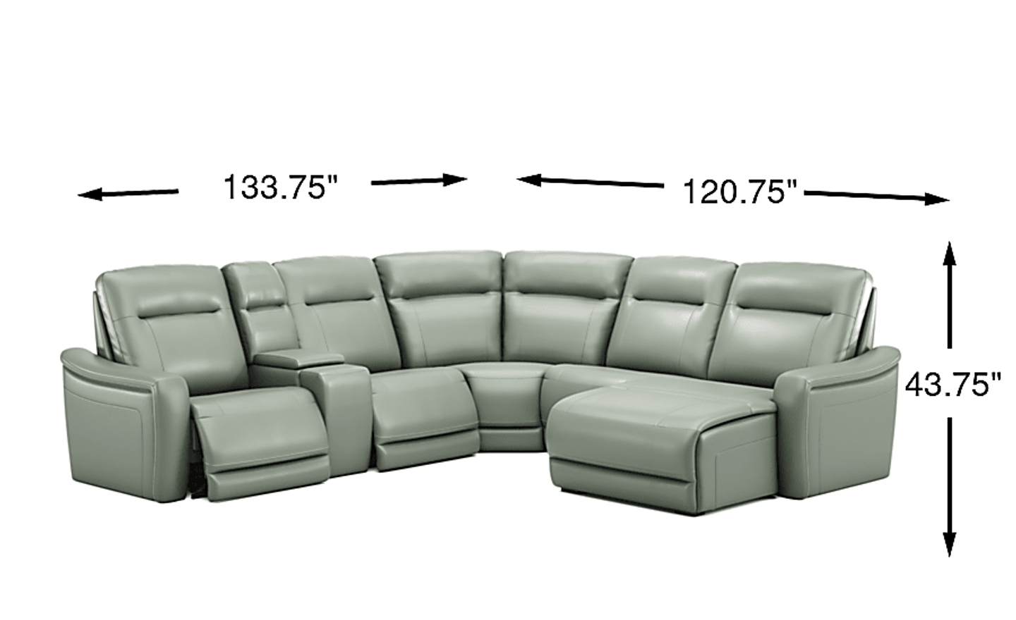 The sleek design, understated sophistication and casual profile of the Drew & Jonathan Newport sectional presents a warm, inviting feeling the whole family can enjoy. Modern in style, this sectional is upholstered in a soft, supple mint-colored top grain leather where the body touches with stylish double top-stitched seams for a luxurious look. Curved, padded arms, wide seats and an elongated footrest in the chaise provide ample space for exceptional comfort. The console adds more space as its hidden cupholders and storage compartment hold your relaxation essentials perfectly, as well as additional charging ports for devices. Dual power reclining functions provide the finishing touch, allowing adjustments in the head and footrest with a patented zero gravity mechanism for the ultimate lounging experience. Upholstery: Top grain leather where the body touches. Vinyl sides and back.