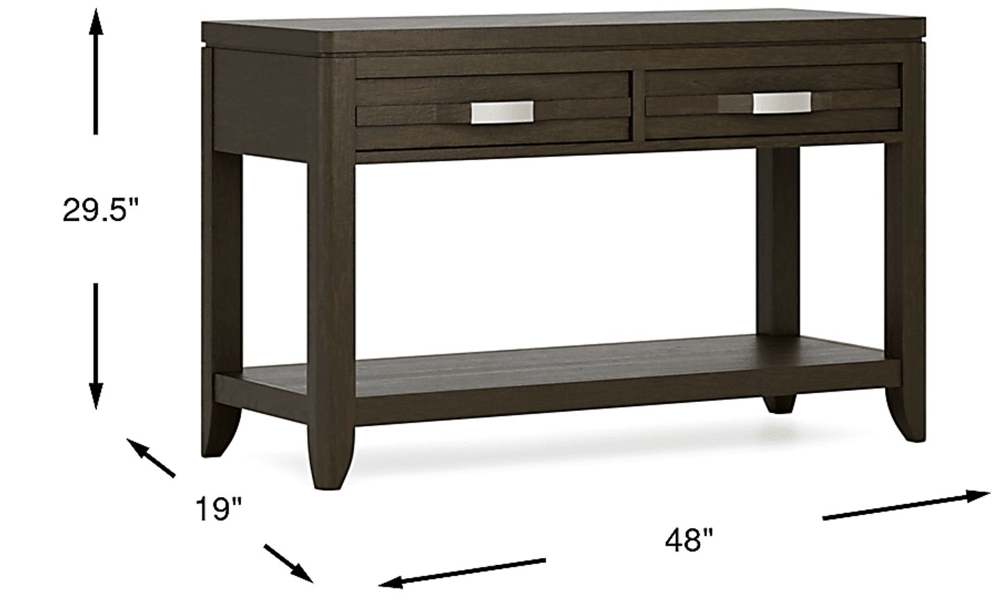 Bringing style and storage, the Niccolo sofa table is an ideal way to complete your living room. Featuring a brown finish accented with sleek matte chrome hardware, this piece also boasts a pair of drawers for keeping clutter under control and a bottom shelf to display your favorite knickknacks. Customer assembly required