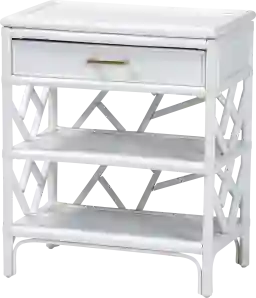 Impart a quality of paradise to your bedroom with the rustic flair of the Nightshack white nightstand. This bohemian piece is handcrafted from sustainably sourced natural rattan. The drawer and two open shelves offer space to organize all your bedside essentials while reserving the tabletop for nightly use. The Nightshack will arrive fully assembled and features a modern geometric design along its frame for vibrant charm. Fitted with a metal drawer handle, the Nightshack nightstand is an enchanting bedroom complement. Rattan is a product of nature and may have variations in areas such as, but not limited to, color, pattern, grain and texture. The hair-like strands of rattan/rattan-fiber are common due to the nature of the material.