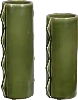 This dynamic Nokola set of two green ceramic vases showcases a distinctive zig-zag edge design that adds a modern touch to your decor. The rich green finish creates a bold statement, making them perfect for displaying fresh flowers or as stunning decorative accents. With their unique shape and vibrant color, these vases effortlessly elevate any space, whether on a dining table, shelf, or mantel.