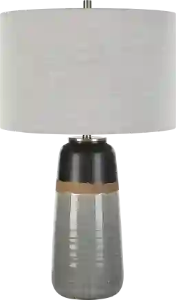 The Norwood Valley lamp features a warm gray and aged black glaze finish on a ceramic body, separated by a rustic brown uneven band, accented with brushed nickel details. The round drum shade is made with a casual light gray linen fabric. Due to the nature of fired glazes on ceramic lamps, finishes will vary slightly. Partial assembly may be required.