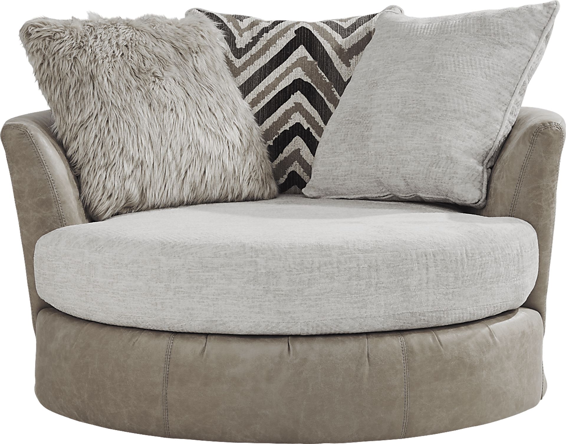 Sit in style with the Novelia swivel chair. Upholstered in woven fabric, this piece is versatile and perfect for any space. Multitextured accent pillows add edge to the contemporary feel as hues of beige, black and brown pop against the chair's neutral tone. Perfect for additional seating, this piece pivots back and forth keeping guests involved in multiple conversations. Upholstery: 100% Polyester
