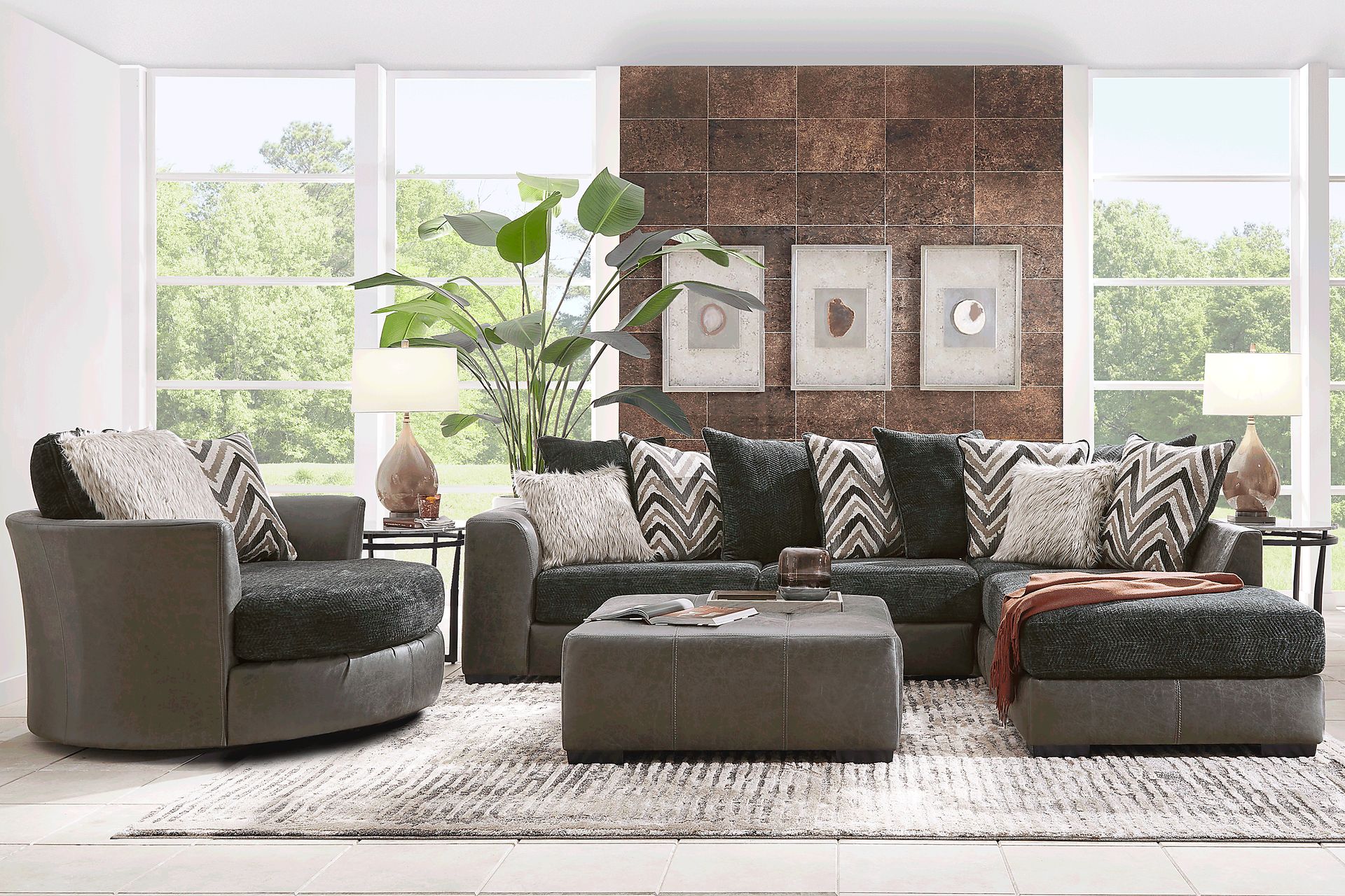 Leisure comes easy with the Novelia living room. Upholstered in soft woven fabric, this collection boasts multitextured scatter back pillows in eye-catching shades of black, beige and brown. The chaise provides easy leisure as reversible seat cushions promise long-lasting style. For decorative dimension, dark seat cushions top the charcoal base while black-finished block legs finish the look. Sleek track arms enhance the contemporary design, making it a focal point of any room. Completing this collection is a matching cocktail ottoman perfect for additional seating, foot resting and more. Upholstery: 100% Polyester. Cleaning Instructions: Use water based cleaning agents or foam.