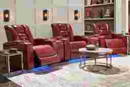 Create the perfect TV room with the Novi home theater sectional. This unique piece combines three Novi dual power reclining red chairs that feature built-in cupholders and lighting with three consoles that provides extra storage. Upholstery: 100% Polyester Cleaning Instructions: Use water based cleaning agents or foam. Tables & lamps not as shown in room image.