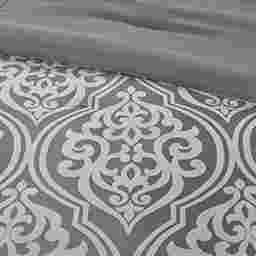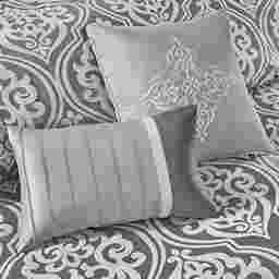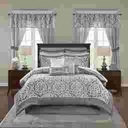Update your entire bedroom all at once with the Nyelle 24 piece room in a bag. The jacquard comforter creates a lavish look with its traditional ornate pattern and pieced design in rich hues. Coordinating shams reflect the motif seen on top of the bed, while luxurious euro shams complement the handsome color scheme. Four decorative pillows with embroidered details and fabric manipulation techniques and a solid bed skirt provide the finishing touches to complete the collection. Also included are four solid window panels and two valances that allow you to create the perfect balance of style in your bedroom. Each window panel matches back to the bedding set and includes a tie-back to give a clean and crisp finish to your decor. This set includes 1 comforter, bed skirt, 2 shams, 2 euro shams, 2 square pillows, 2 oblong pillows, 1 flat sheet, 1 fitted sheet, 2 pillowcases, 4 window curtains, 4 ties and 2 valances.