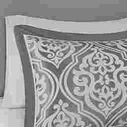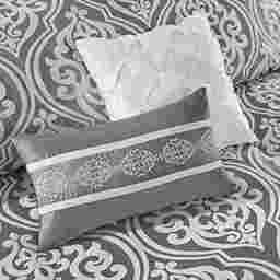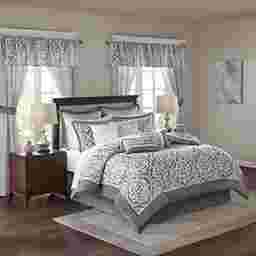 Update your entire bedroom all at once with the Nyelle 24 piece room in a bag. The jacquard comforter creates a lavish look with its traditional ornate pattern and pieced design in rich hues. Coordinating shams reflect the motif seen on top of the bed, while luxurious euro shams complement the handsome color scheme. Four decorative pillows with embroidered details and fabric manipulation techniques and a solid bed skirt provide the finishing touches to complete the collection. Also included are four solid window panels and two valances that allow you to create the perfect balance of style in your bedroom. Each window panel matches back to the bedding set and includes a tie-back to give a clean and crisp finish to your decor. This set includes 1 comforter, bed skirt, 2 shams, 2 euro shams, 2 square pillows, 2 oblong pillows, 1 flat sheet, 1 fitted sheet, 2 pillowcases, 4 window curtains, 4 ties and 2 valances.
