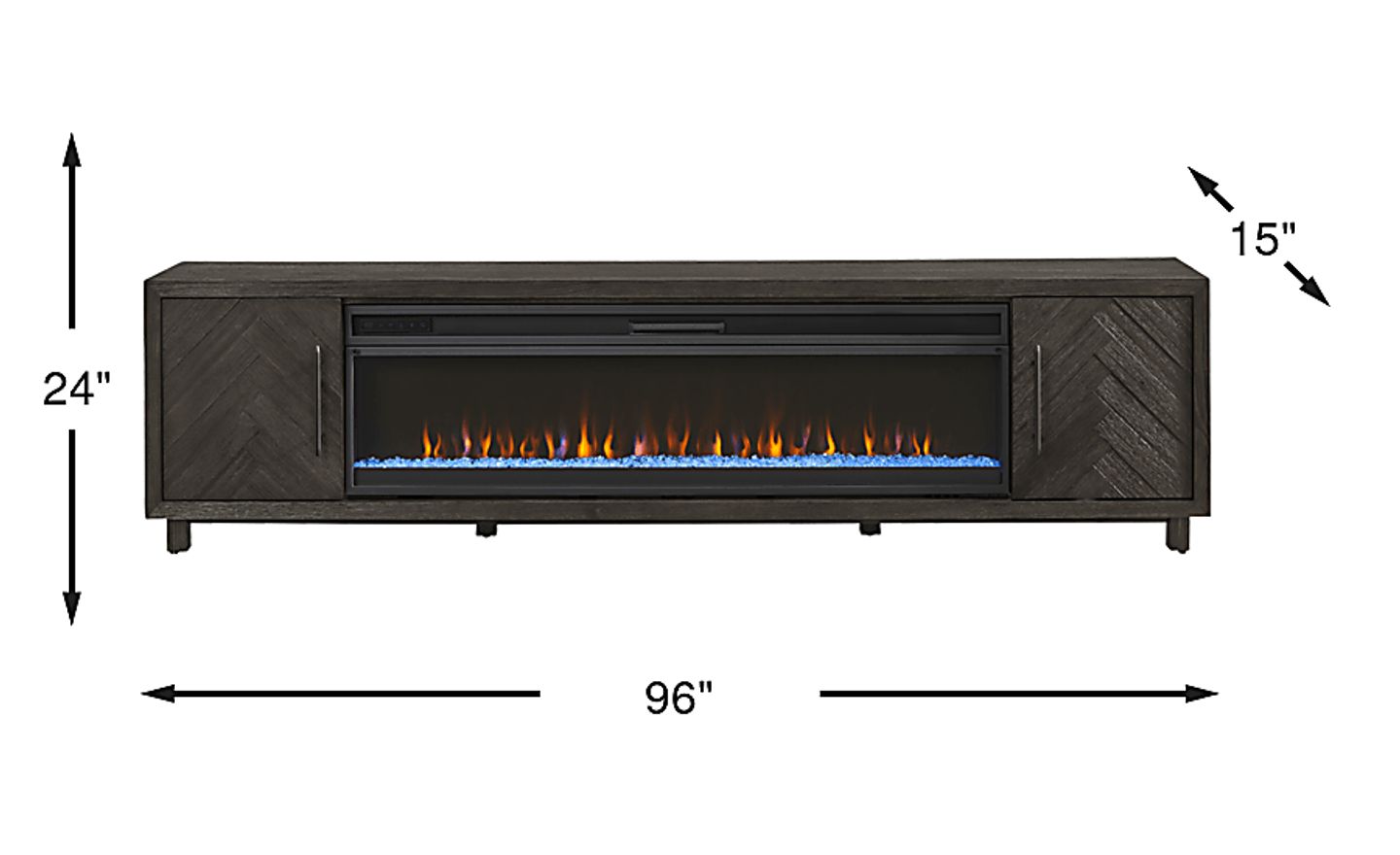 Cinematic stillness settles around the Oakleigh credenza, its bold presence an anchor for everyday rituals as well as providing warmth for a home filled with friends and family. This contemporary accent features a dark charcoal finish accented with black metal hardware on a pair of chevron-patterned doors with two shelves each. Wire management holes on each shelf keep the look tidy. The included fireplace portion features an energy-saving LED firebox with remote controlled heat and ambient lighting that you and your guests will love.