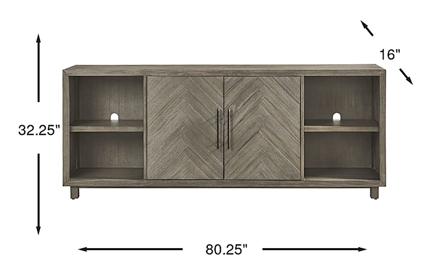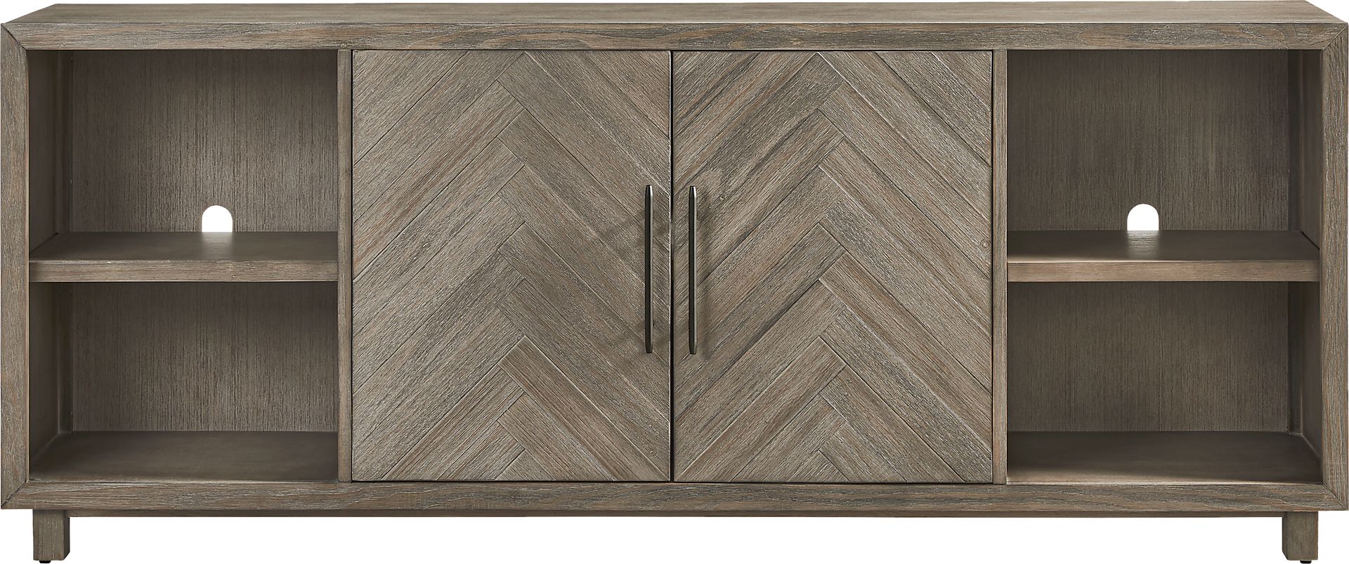 Cinematic stillness settles around the Oakleigh credenza, its bold presence an anchor for everyday rituals as well as providing warmth for a home filled with friends and family. This contemporary accent features a gray finish accented with black metal hardware on a pair of chevron-patterned doors. The shelves behind each door offer discreet storage, while open shelves can be used for display. Wire management holes on each shelf keep the look tidy whether the doors are installed in the center or to either side.
