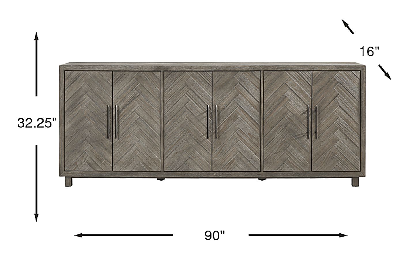 Cinematic stillness settles around the Oakleigh credenza, its bold presence an anchor for everyday rituals as well as providing warmth for a home filled with friends and family. This contemporary accent features a gray finish accented with black metal hardware on three sets of chevron-patterned doors. The shelves behind each door offer discreet storage, with wire management holes to keep the look tidy.