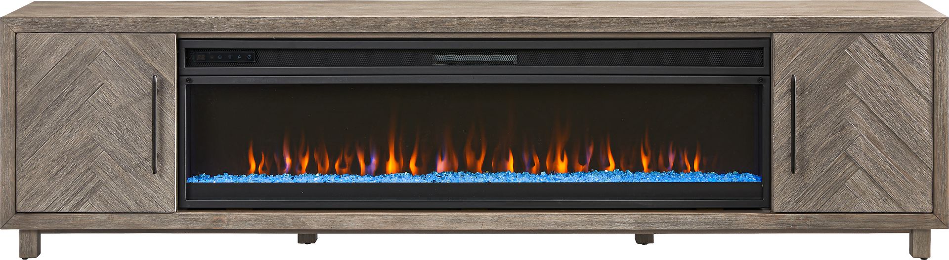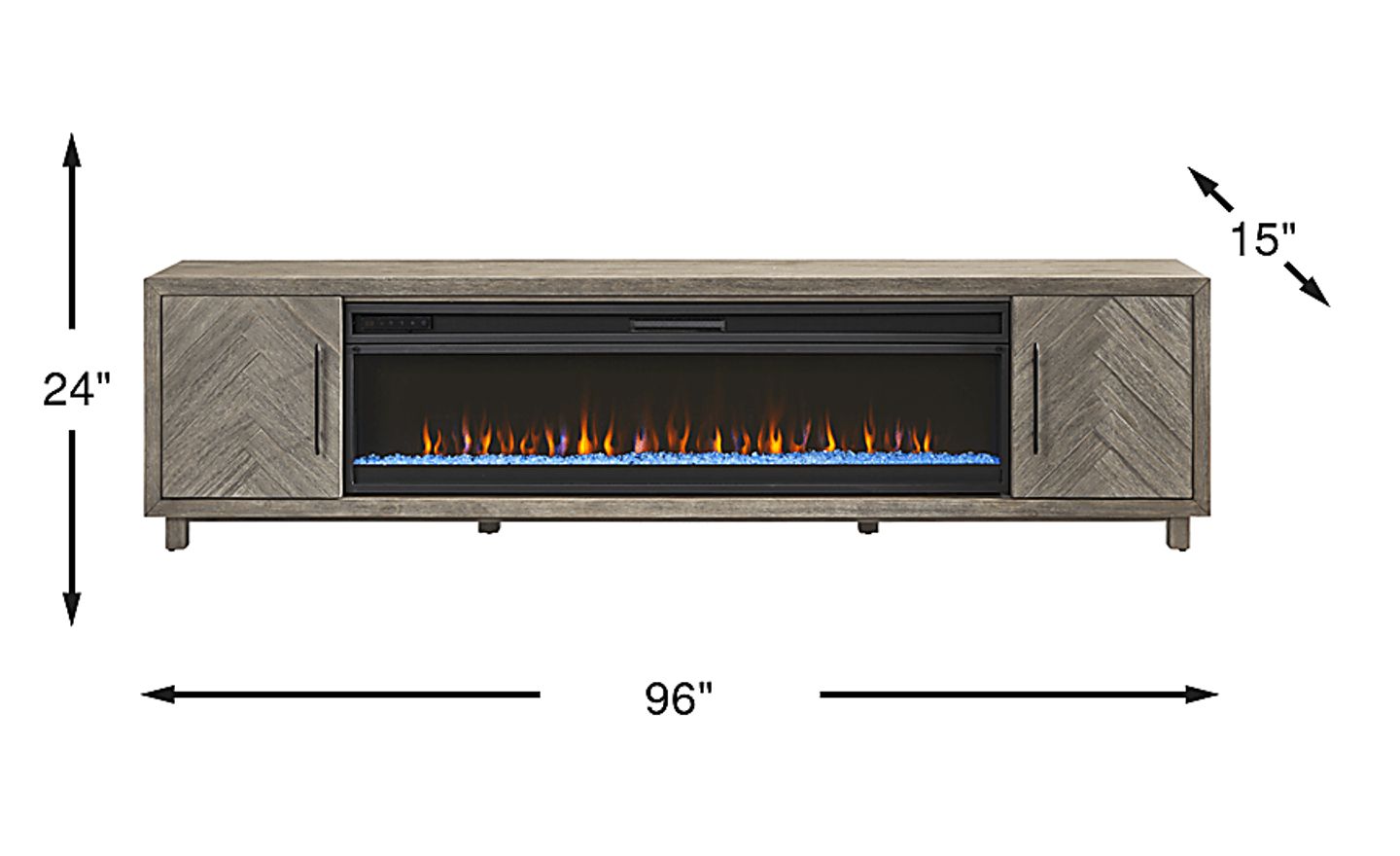 Cinematic stillness settles around the Oakleigh credenza, its bold presence an anchor for everyday rituals as well as providing warmth for a home filled with friends and family. This contemporary accent features a gray finish accented with black metal hardware on a pair of chevron-patterned doors with two shelves each. Wire management holes on each shelf keep the look tidy. The included fireplace portion features an energy-saving LED firebox with remote controlled heat and ambient lighting that you and your guests will love.