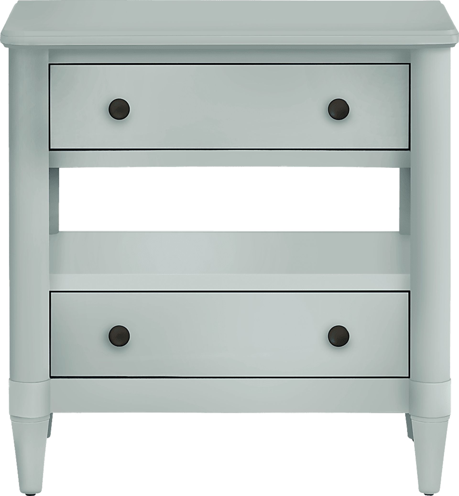 Down-home warmth and comfort get the lightest touch of regal class in the expressive curves and thoughtful details of the Oakwood Terrace nightstand. This casual piece in a robin's egg blue features turned wood posts on each corner, ending with long, tightly tapered legs for a poised look. Each of its 2 drawers opens with metal knobs in black, and a hidden USB port adds convenient charging. A small open cubby in the middle can be used to catch your favorite bedtime read.