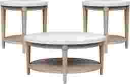 The gentle tones and casual elegance of the Oakwood Terrace collection brings soft, breezy sophistication to your home. Crafted with a harmonious mix of textures and tones, this set's round cocktail table exudes approachable elegance. A bright white top rests gracefully on tapered legs, blending casual warmth with a touch of refinement. An open lower shelf provides space for books, baskets or decor, enhancing both function and style. The balanced composition feels both grounded and light, inviting a sense of calm while creating the perfect stage for conversation and connection. A pair of matching end tables completes the set.