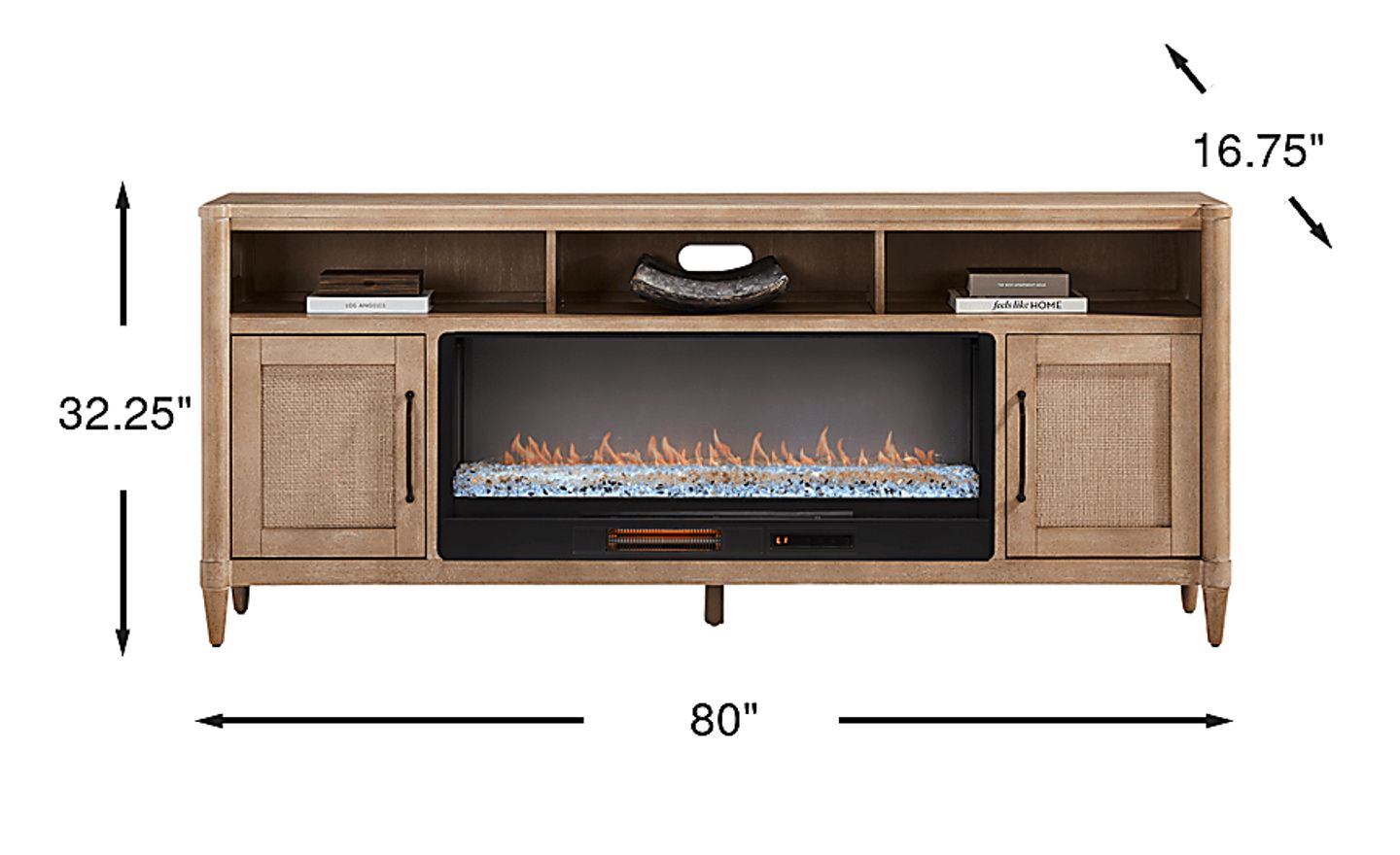 The gentle tones and casual elegance of the Oakwood Terrace collection brings soft, breezy sophistication to your home entertainment center. This console features a sandy beige finish and a clean rectangular frame, offering a warm, grounded look that suits both casual and elevated interiors. Two paneled doors open to reveal spacious shelving for tucked-away storage, while three cubbies at the top provide display space for decorative accents. At the center, an energy-saving LED firebox provides remote-controlled heat and ambient lighting with four color-changing options, creating a warm and cozy atmosphere at the touch of a button. Tapered legs and black metal pulls add subtle contrast and tailored appeal, making this console sophisticated and refined.