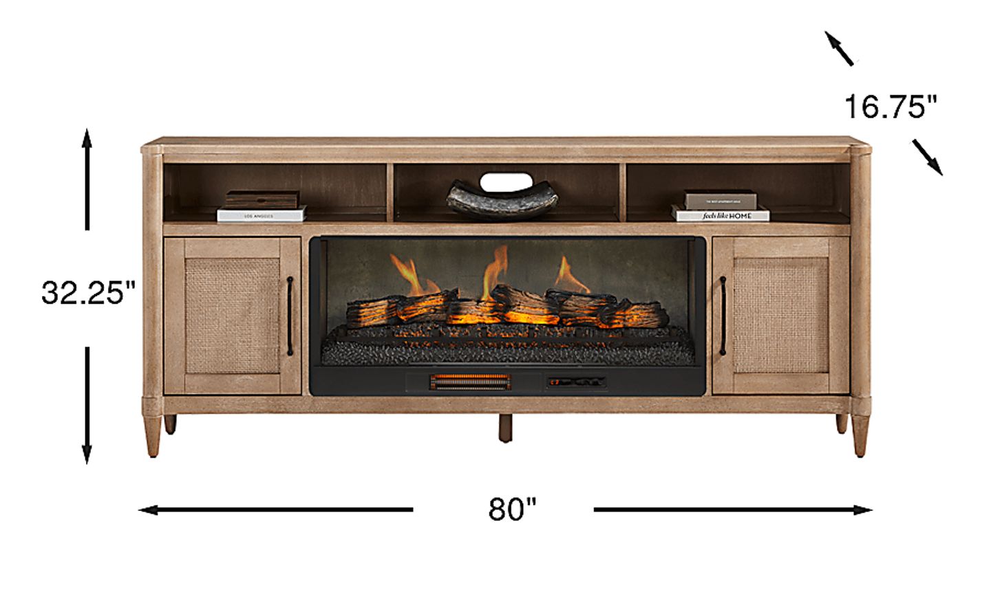 The gentle tones and casual elegance of the Oakwood Terrace collection brings soft, breezy sophistication to your home entertainment center. This console features a sandy beige finish and a clean rectangular frame, offering a warm, grounded look that suits both casual and elevated interiors. Two paneled doors open to reveal spacious shelving for tucked-away storage, while three cubbies at the top provide display space for decorative accents. At the center, a removable fireplace portion features flickering flames and faux embers, working with or without heat for a warm ambiance year-round. Tapered legs and black metal pulls add subtle contrast and tailored appeal, making this console sophisticated and refined.