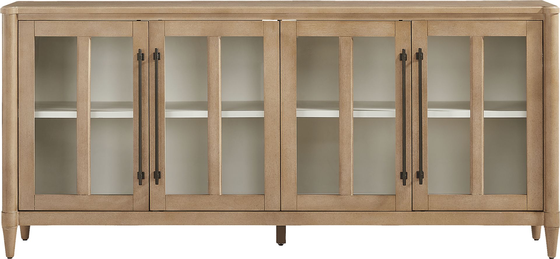 The gentle tones and casual elegance of the Oakwood Terrace collection brings soft, breezy sophistication to your home entertainment center. This console features a sandy beige finish and a clean rectangular frame, offering a warm, grounded look that suits both casual and elevated interiors. Two pairs of glass inlayed cabinet doors open to reveal spacious shelving perfect for decorative accents or organized storage. Tapered legs and elongated black metal pulls add subtle contrast and tailored appeal, making this console timeless and refined.