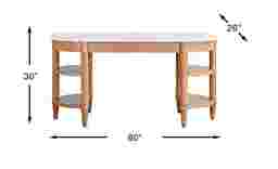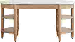 The gentle tones and casual elegance of the Oakwood Terrace collection brings soft, breezy sophistication to your home. Featuring a soft silhouette and airy profile, this contemporary desk creates a stylish contrast by pairing a smooth white oval top and sandy beige base with gently rounded legs and tapered feet. Open shelves on both ends provide ample display space, while a sleek single drawer offers space for hidden storage.