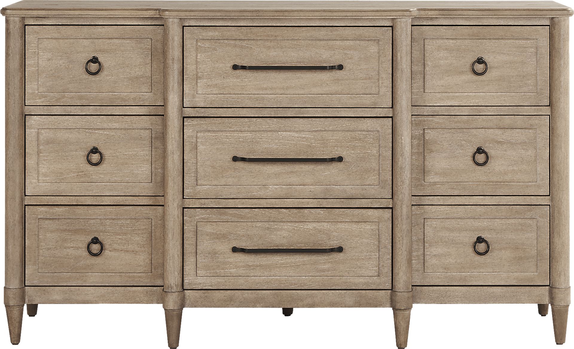 Down-home warmth and comfort get the lightest touch of regal class in the expressive curves and thoughtful details of the Oakwood Terrace dresser. This casual piece in tan features turned wood posts on each corner, ending with long, tightly tapered legs for a poised look. Each of its 9 drawers opens with metal ring pulls or bar pulls in a black finish.