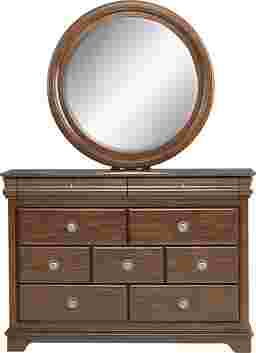 Details like rounded corners and pewter hardware give the Oberon dresser and mirror set heirloom appeal. It is crafted of poplar solids, with a rich dark cherry finish that gives it a timeless versatility. Two top keyhole drawers are felt-lined, while the below seven drawers offer plenty of space for storing their entire wardrobe throughout the seasons. The round shape of the mirror makes it a fun addition to their bedroom, adding a stylish place to prepare for the day ahead.
