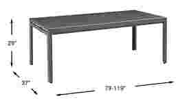 Make room for more food and more friends with the Ocean Tide extension table. This 37 x 79 inch outdoor dining table expands to a generous 119 inches with a convenient self-storing leaf. The rectangular top, made to look like wood with a lightweight Duraboard top, is supported by a rust proof aluminum frame and legs in a gray finish.