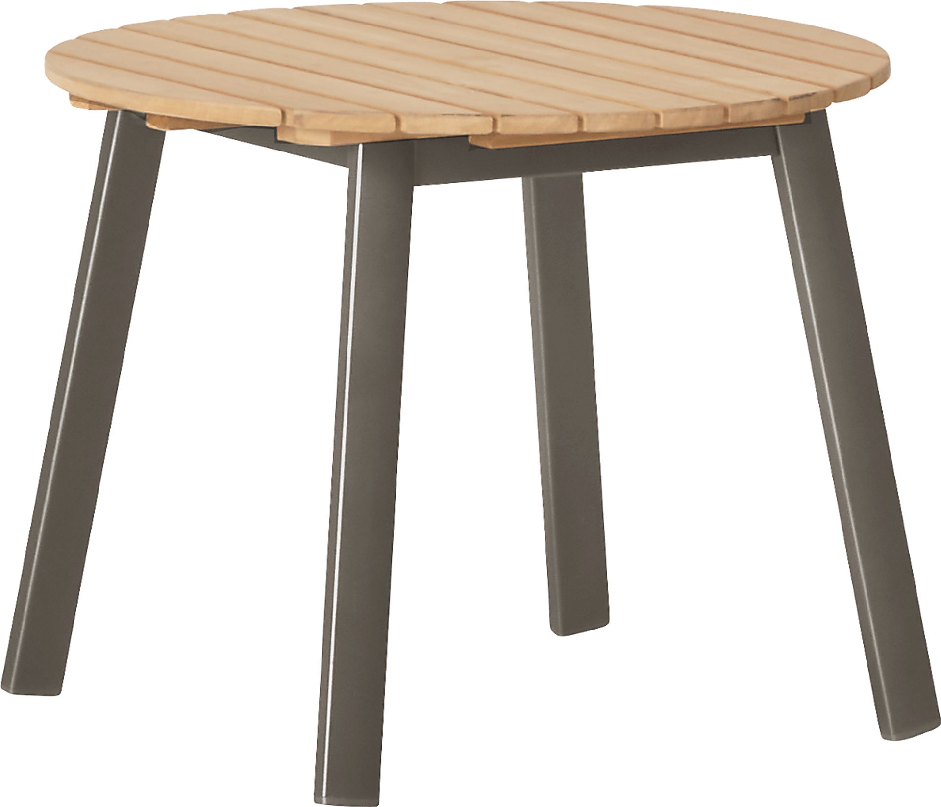 Complete your patio set with the Ocean Tide end table. This durable outdoor table features a 20 - inch round teak top supported by all-weather, rust resistant aluminum legs in a gray finish. It the ideal spot for a refreshing drink, magazine or sunscreen.
