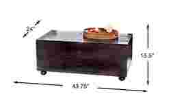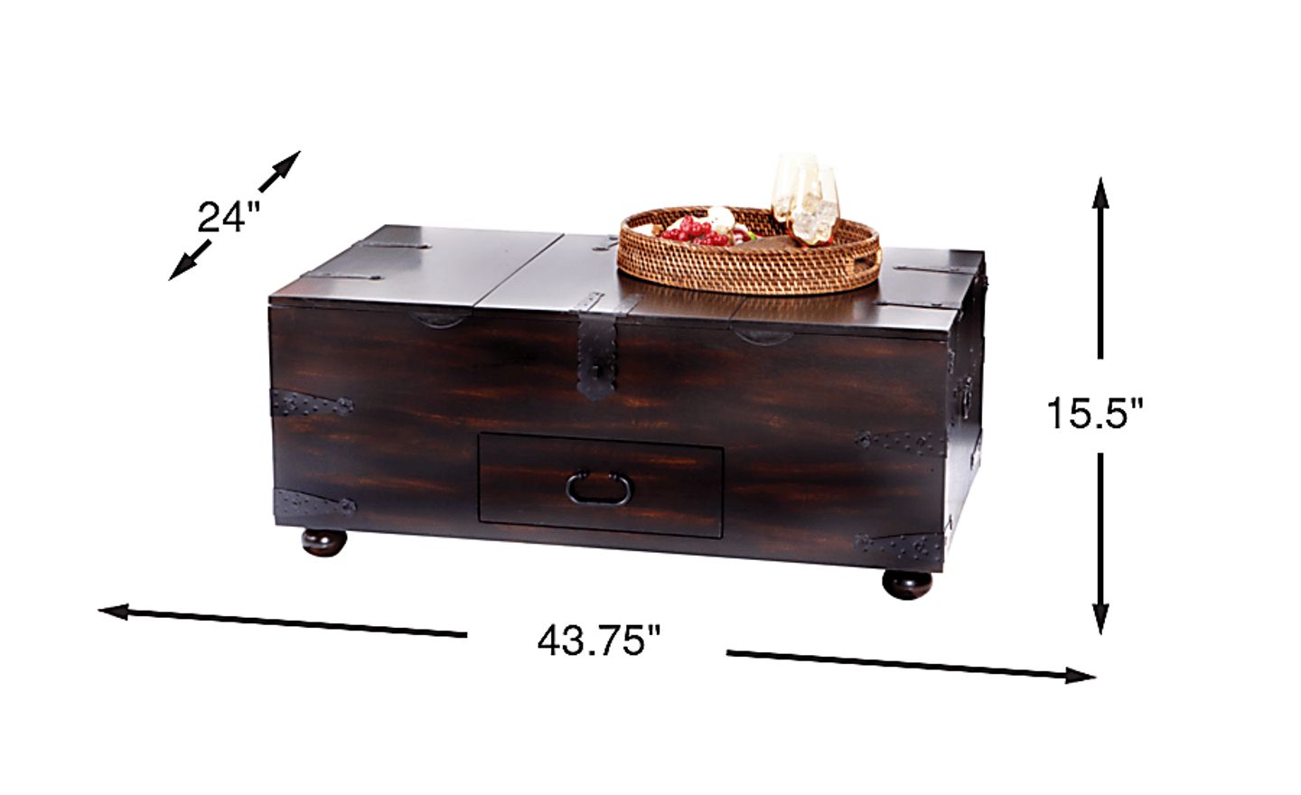 The beautiful Old World look of the Oconee cocktail table captures the English Colonial period with character and personality. Crafted of mahogany solids and Indonesian hardwood veneers in an espresso finish, the table boasts authentic rough-hewn metal accents and drawer pulls that create the look of a vintage steamer trunk. Features include a drawer on the front and three pull out lid supports to increase usable table top surface space. The deep area inside includes removable dividers and a secret storage compartment. (The table's lids feature a child safety mechanism.)